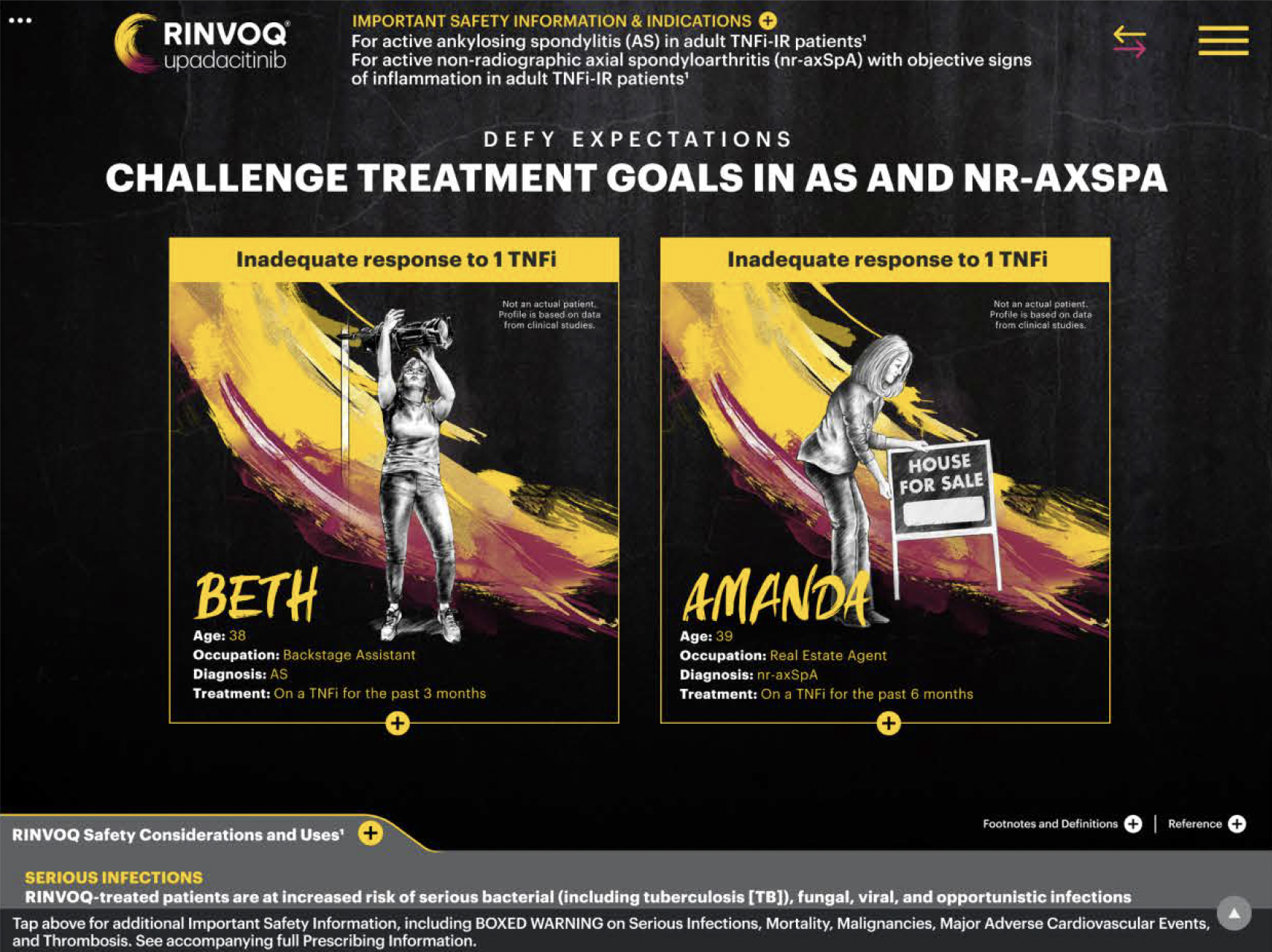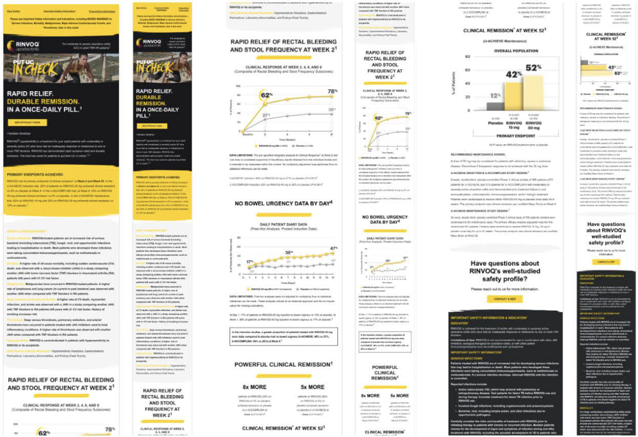 I worked as apart of a cross-functional team that collaborated with Project Managers, Creative, Quality Assurance and more to make sure all of our digital and physical initiatives were built to design expectations and studio guidelines. With the wide variety of work Pharmaceutical Marketing touches, I was able to work and manage a variety of clients. Please go ahead and check out a couple samples of my work below.