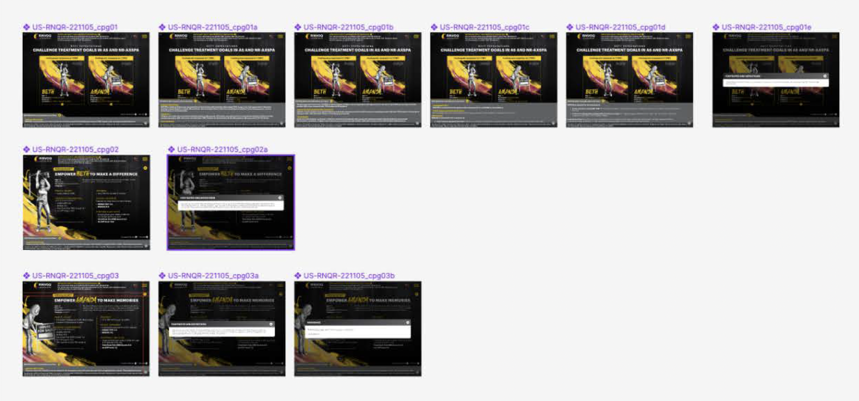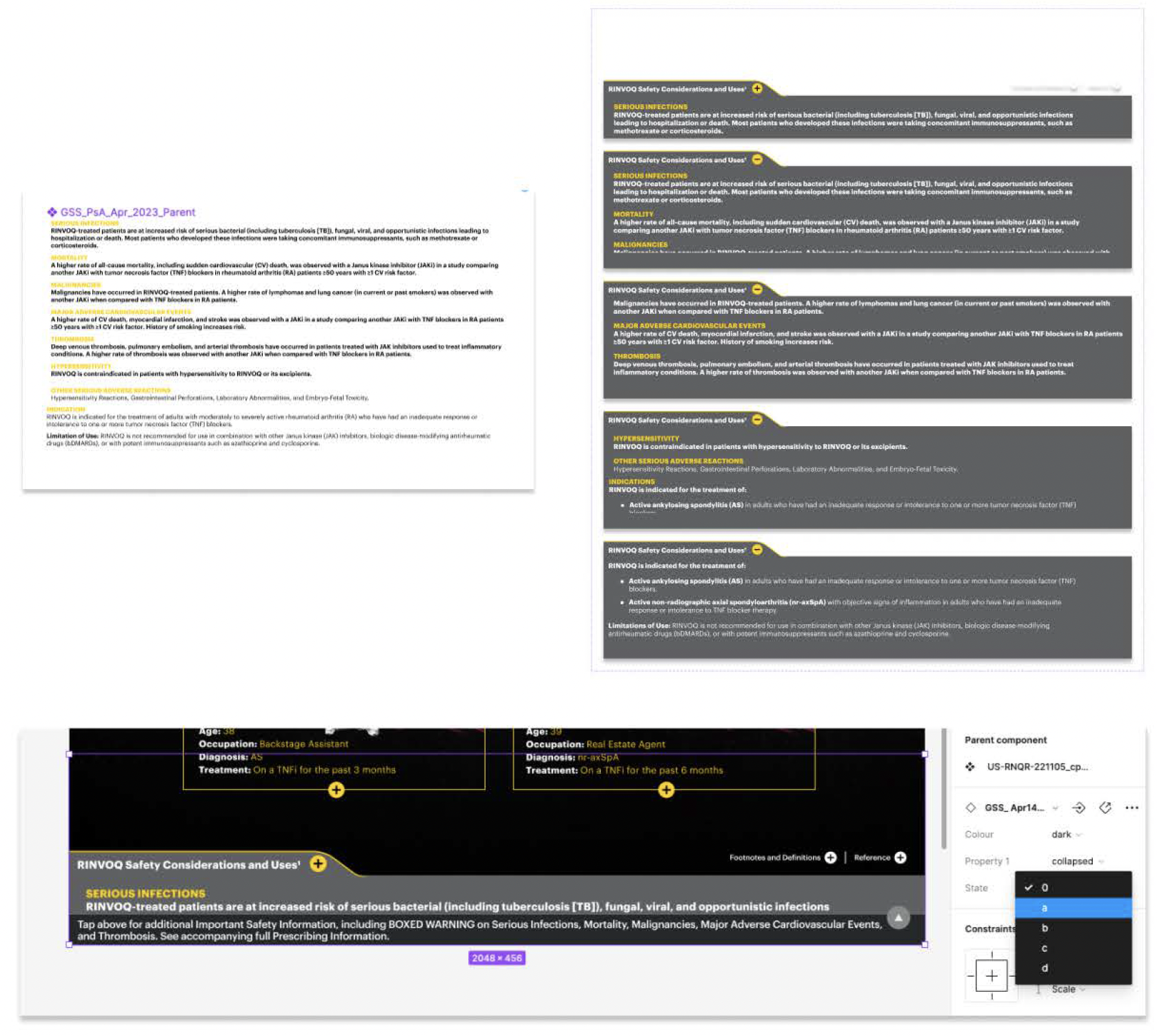 Traditionally, IVA’s (or Interactive Sales Aids) were traditionally built within Sketch or Photoshop. Within the amount of repeated assets and components, I convinced the leads to move everything over to Figma. This helped because of the prototyping features within the application (helps show the engineers where everything is connected), building assets that are meant to be animated (whether an animated ISI or integrated video) or quickly turning a digital aid into a printable PDF.